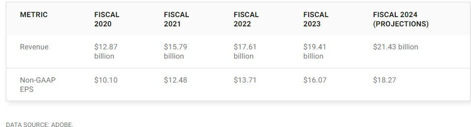 Adobe reported record third-quarter revenue but guided for just $5.5 billion to $5.55 billion in fourth-quarter fiscal 2024 revenue and non-GAAP (adjusted) earnings per share (EPS) of $4.63 to $4.68. In its June report, Adobe guided for full-year revenue of $21.4 billion to $21.5 billion and non-GAAP EPS of $18 to $18.20. Through the end of its third quarter, Adobe generated $15.9 billion in revenue and $13.61 in non-GAAP EPS.
